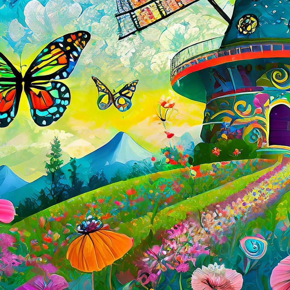 This is a digital artwork of a windmill, butterflies and flowers. A cheerful and colourful painting suitable for any room.