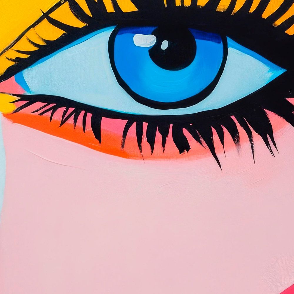 The picture captures the intensity of an eye blink, which is enhanced by bright colours and striking contrasts. The bright blue eye is the centre of attention, surrounded by vibrant yellows and pinks. The ornate eyelashes and vibrant background give the portrait a modern, dynamic look that catches the eye.