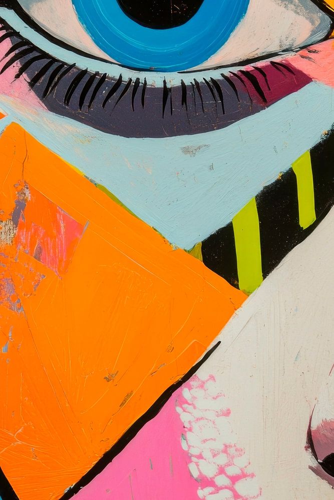 The picture shows a dynamic, colourful depiction of a face in which the bright blue eye catches the eye. Geometric patterns and vibrant colours contrast with the soft features of the face. The bold lines and coloured surfaces lend the composition a modern, artistic energy. A fascinating interplay of shapes and colours captivates the viewer.