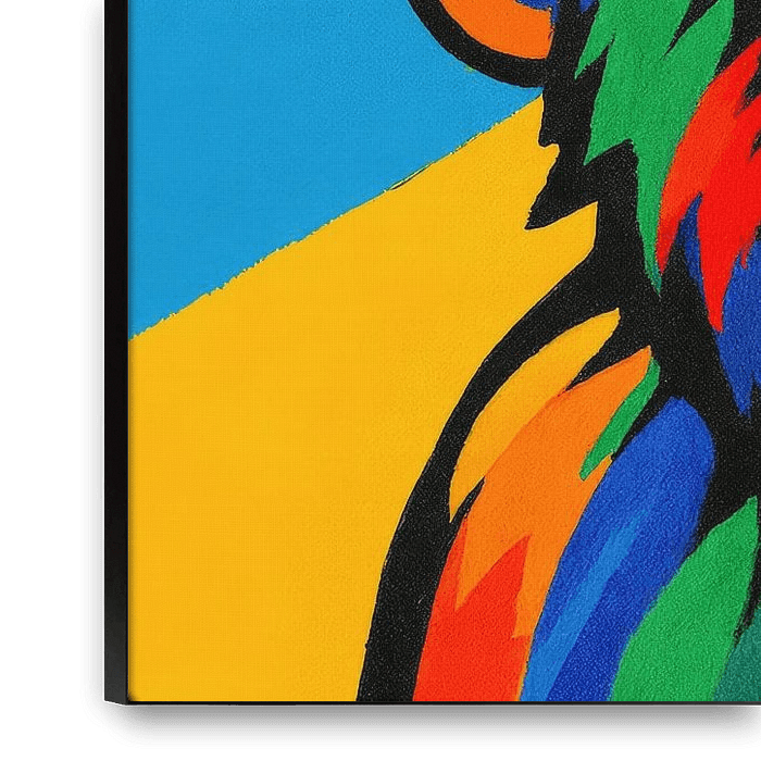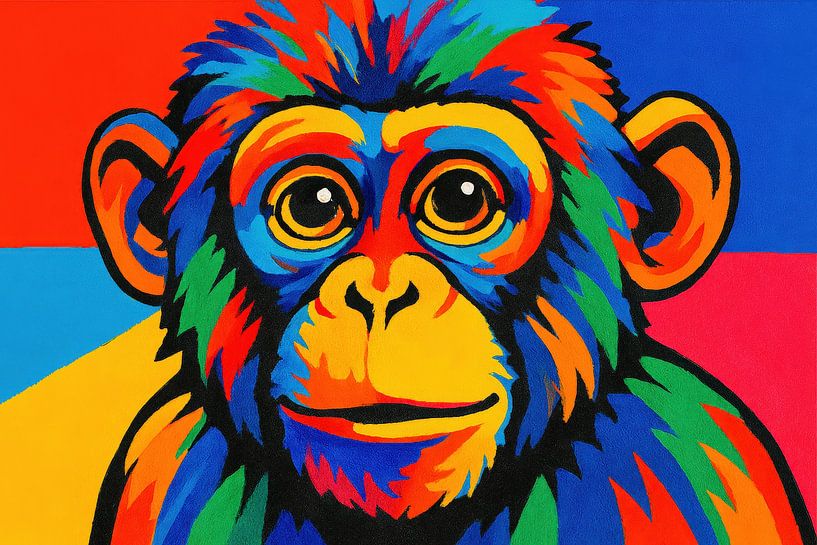 A frontal monkey portrait with large, round eyes looks straight at you, framed by tight contours. Bright areas in red, blue, yellow, green and orange alternate, creating a powerful colour contrast. The face is composed of dynamic shapes that playfully interlock, creating an energetic pop-art look. The background consists of distinct…
