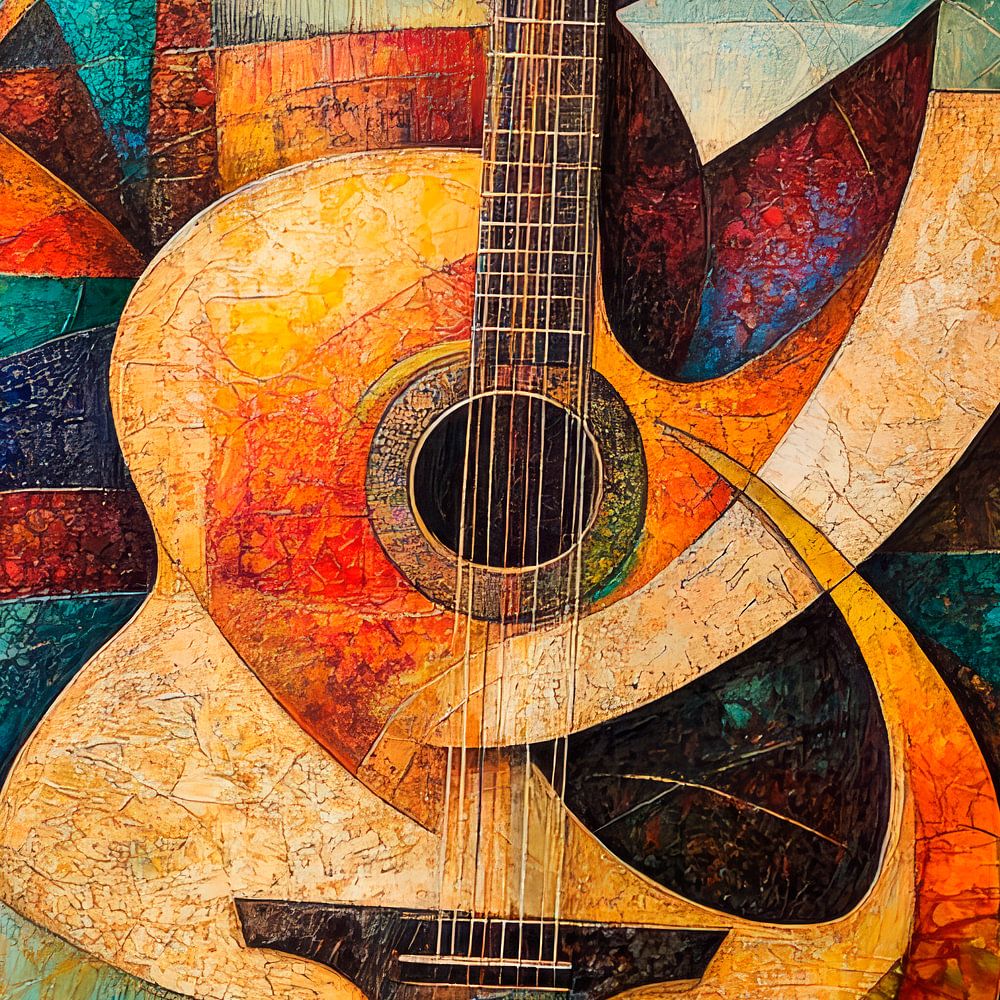 The fantasy image shows a work in the Cubism style, with a centrally placed guitar. The style is reminiscent of the early 20th-century art movement and its associated music movement bossa nova.
