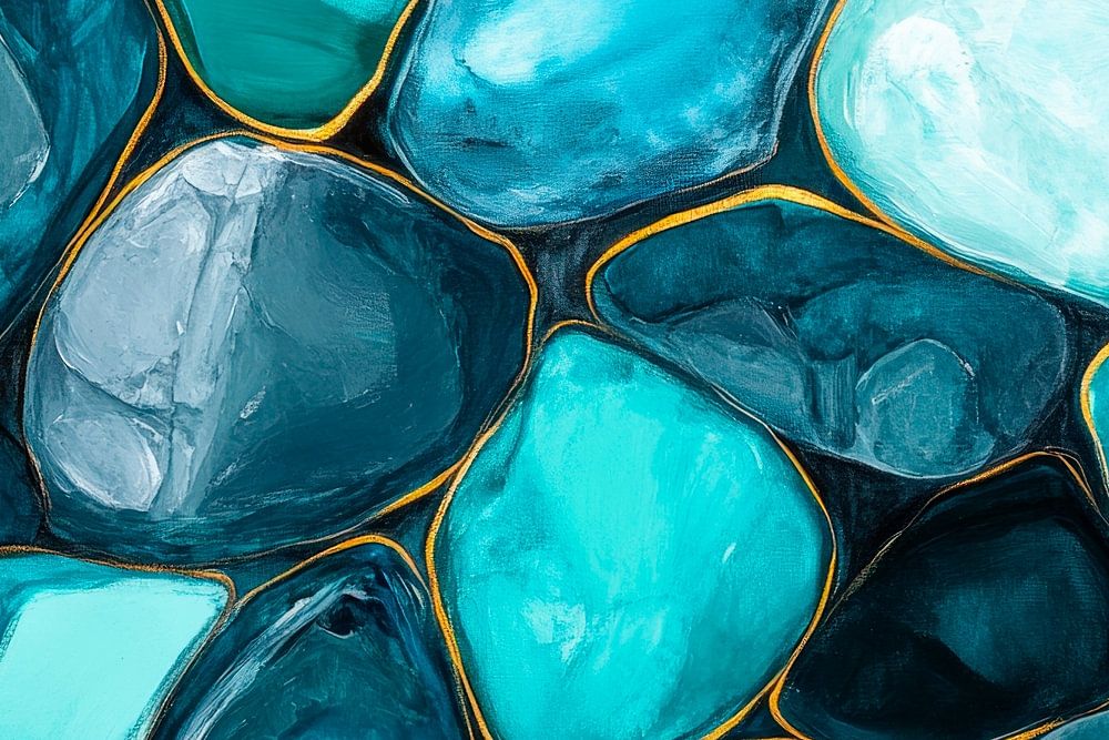 A harmonious interplay of bright turquoise tones and golden accents immediately attracts the eye. The gentle transitions between the smooth, mineral shapes are reminiscent of calming water surfaces and bring with them a natural elegance. Ideal for the living room to create an atmosphere of relaxation and inspiration.