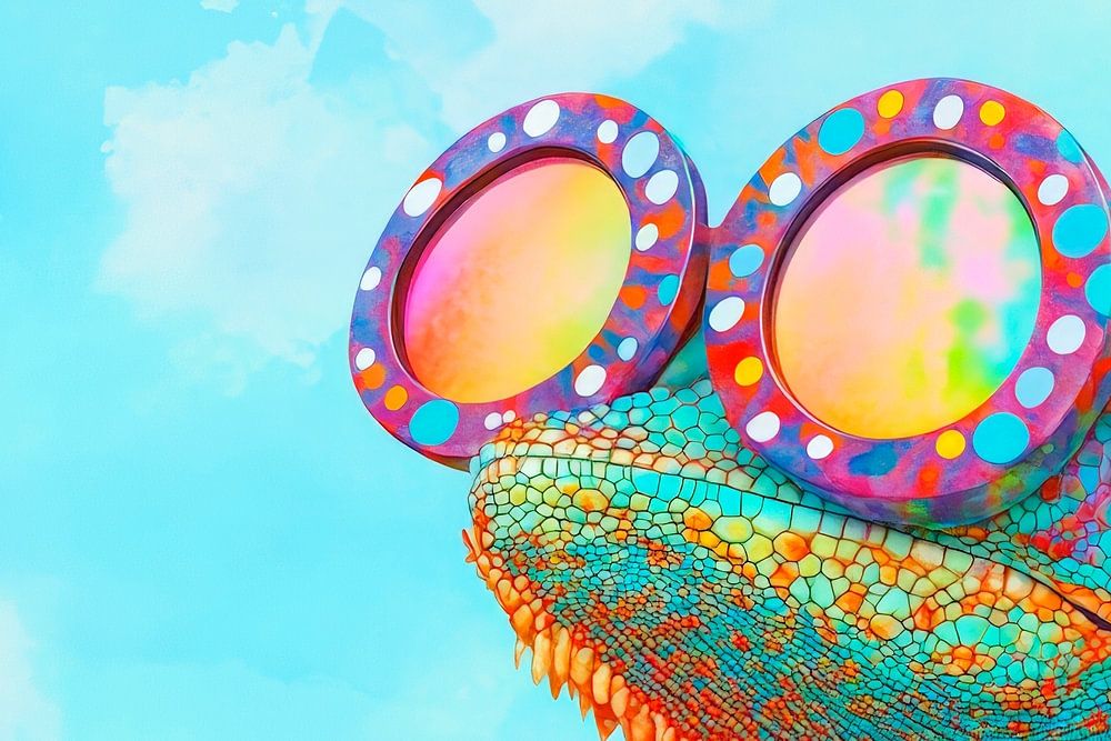 Imagine an amazing cameleon creature looking at the world through iridescent, glittering glasses. The vibrant colours and playful expression add a cheerful touch to any room. Perfect for a living room or a creative study where inspiration and good humour can sprout. A real eye-catcher that stimulates the imagination!