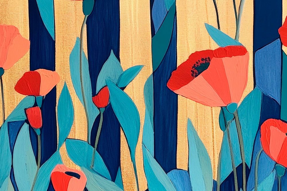 Vibrant poppy blossoms dance on a harmonious background of bright colours and dynamic stripes. Their cheerful red colour immediately attracts attention, while the soft blue and green tones create a sense of calm. This artwork brings a touch of nature into the living room and creates an inviting, lively atmosphere. Ideal for a refreshing accent!