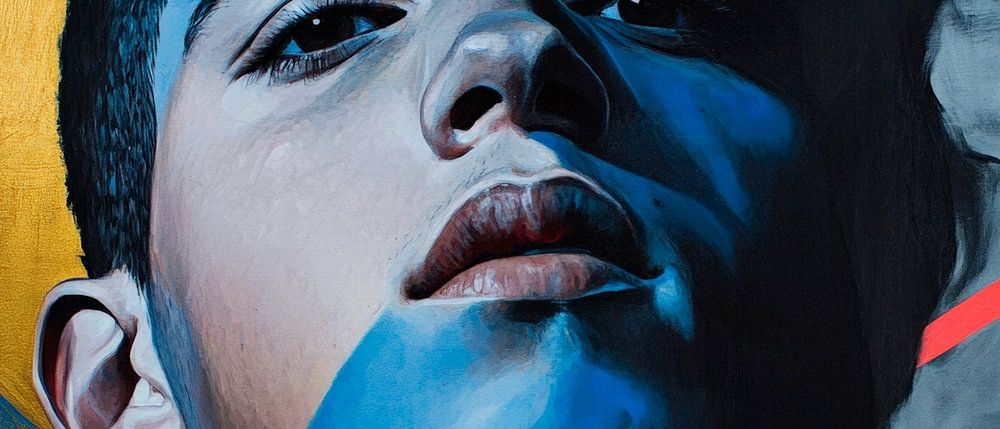 A fascinating interplay of strong blue tones, mysterious smoke and luminous geometric shapes casts a spell over the viewer. The expressive facial expressions radiate both calm and determination. Ideal for the living room, this work of art creates a profound atmosphere and encourages reflection and inspiration.