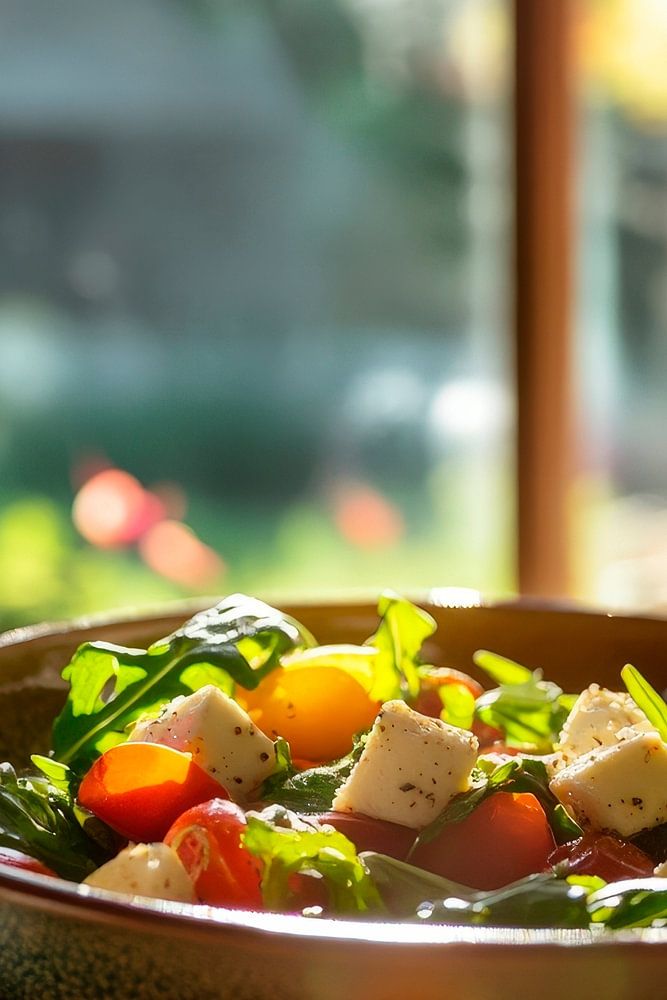 Fresh colours and sumptuous textures invite you to enjoy - a bright salad filled with crunchy vegetables and fine cubes of cheese radiates health and vitality. The gentle rays of sunlight streaming through the window create an inviting atmosphere. Ideal for the kitchen, where every bite conveys joy and harmony.
