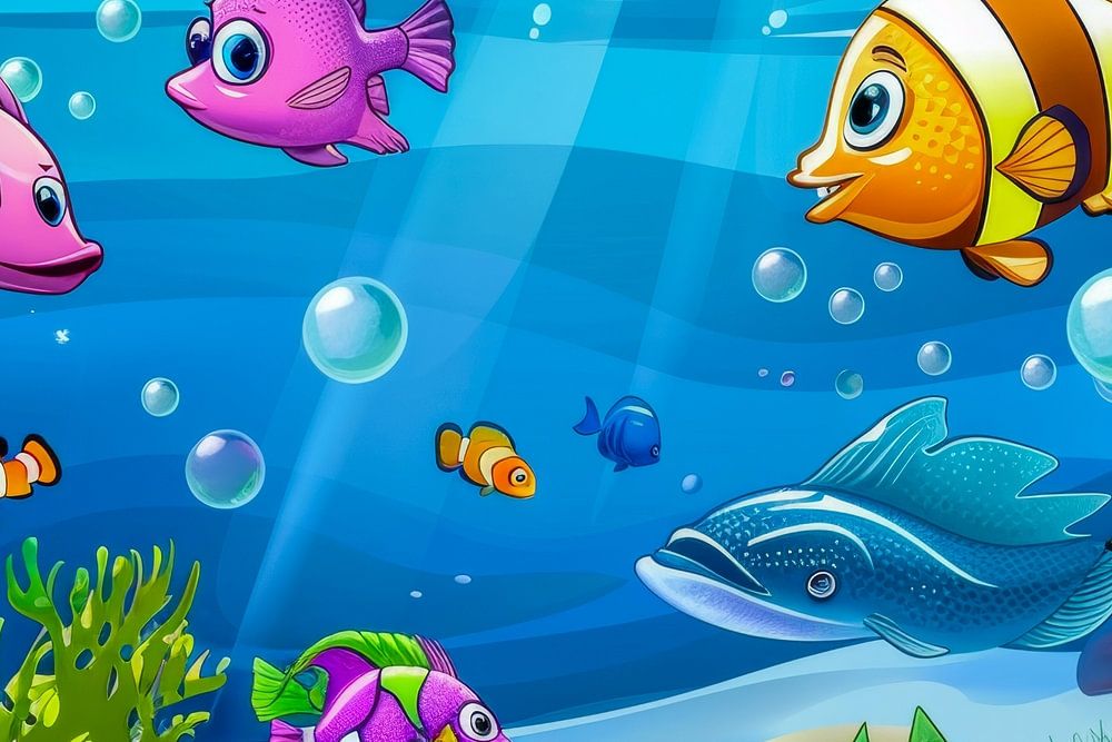 This vibrant and colourful marine life illustration is ideal for brightening up a child's room. The illustration shows a playful underwater world full of happy sea creatures such as colourful fish, funny starfish, cute seahorses and vibrant coral reef.