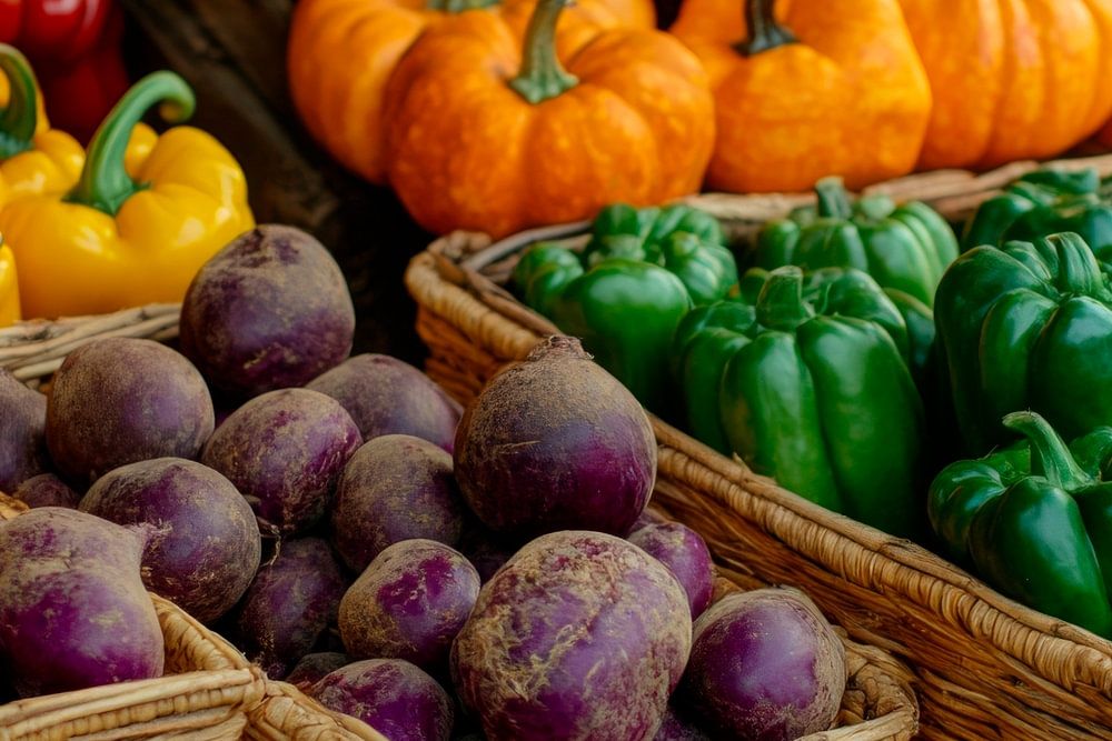Colourful variety awakens a feeling of freshness and fertility! Juicy green peppers, bright pumpkins and heavenly purple plums harmonise in artistic baskets and exude an inviting flair. This lively arrangement brings pep into the kitchen and conjures up a cosy ambience that will delight gourmets and amateur chefs alike.