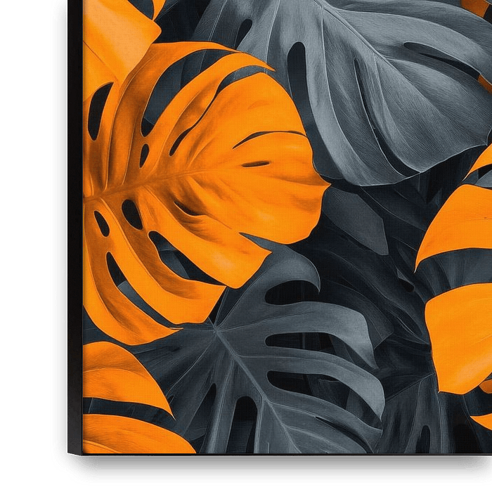 Rich orange dances harmoniously with deep grey, while the magnificent leaves linger in a mysterious jungle. Every cut and every wave of the leaves speaks of vibrancy and elegance. This explosion of colour awakens the senses and draws the viewer into a play of light and shadow, where nature comes to life in a creative way.