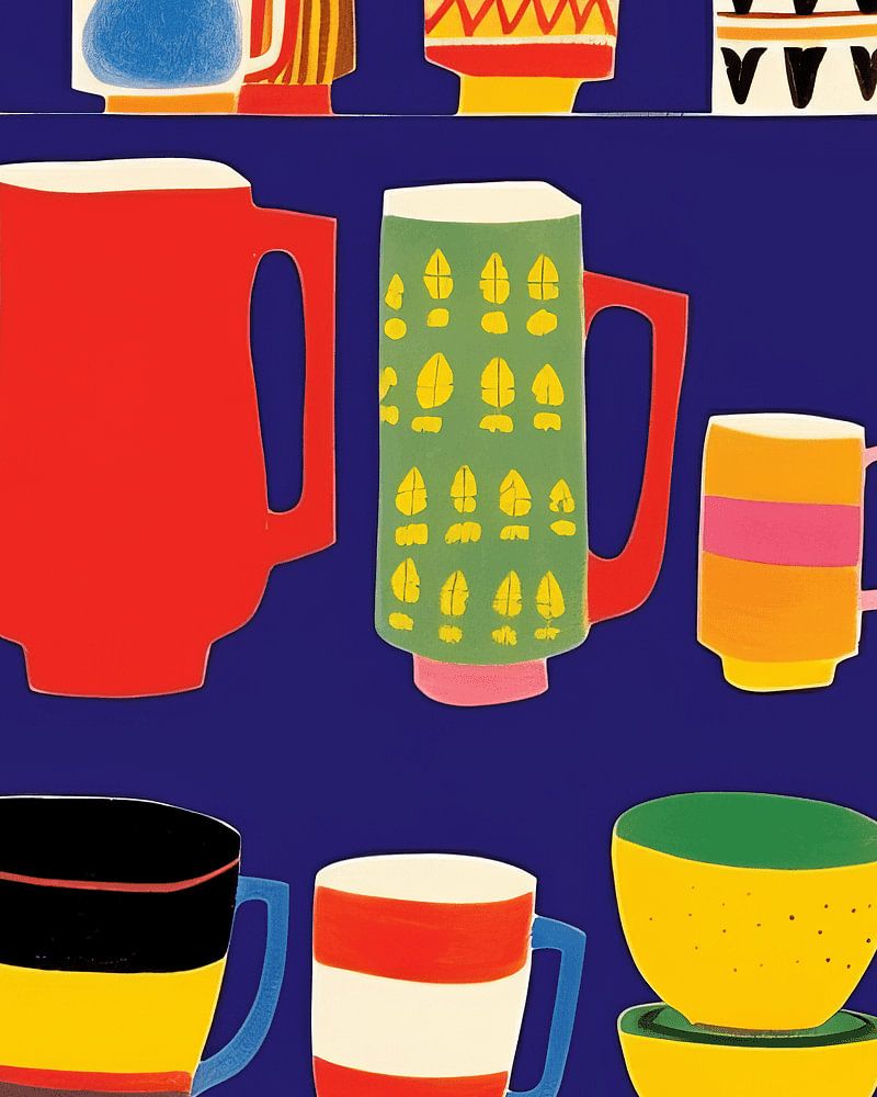 Buy this still life Colourful tableware, modern illustration by Studio Allee on canvas, ArtFrame, poster and wallpaper, printed on demand in high quality