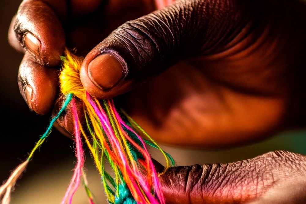 In a fascinating interplay of colour and dexterity, these skilled hands capture various colourful threads. The vibrant texture and artful craftsmanship add a creative touch to any room. Ideal for the living room, it evokes craftsmanship and tradition and invites you to share stories and find inspiration.