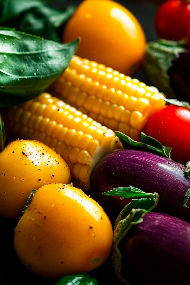 Juicy tomatoes, bright yellow peppers and velvety aubergines come together in a harmonious interplay of radiant colours to create a delicious still life. Fresh basil rounds off the composition, while the dark base lets the colours shine vividly. This work of art is a wonderful addition to any kitchen and inspires culinary creations.