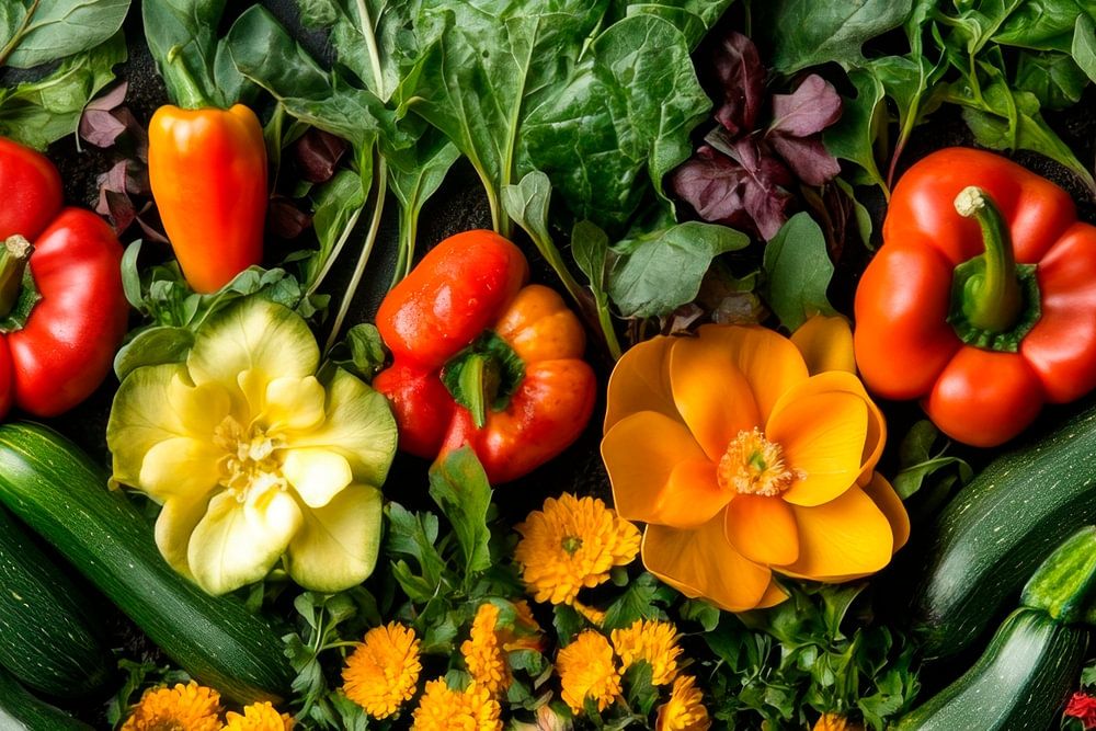 A cheerful sea of colour unfolds in a colourful composition of fresh vegetables and edible flowers. Red peppers, bright courgettes and the lush green of lettuce leaves invite you to experiment with culinary delights. This vibrant still life brings a touch of nature and freshness into the kitchen and inspires delicious dishes.