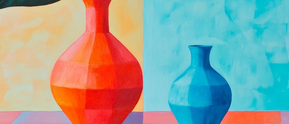 Two vases dance around the room in vibrant colours and give it a fresh, modern touch. The vibrant reds and blues harmonise perfectly with the playful pattern of the background, while a single leaf adds vitality to the large vase. This piece is ideal for a bright living room, where it becomes an eye-catcher and creates atmosphere.