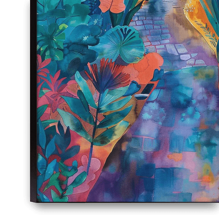 This beautiful watercolour design captures the essence of a vibrant summer landscape. It is an enchanting depiction of lush plants and colourful flowers, which together surround a path inviting a walk in a magical forest. The rich hues of blue, green, yellow, orange and purple give the painting a dynamic and vibrant character, making it…