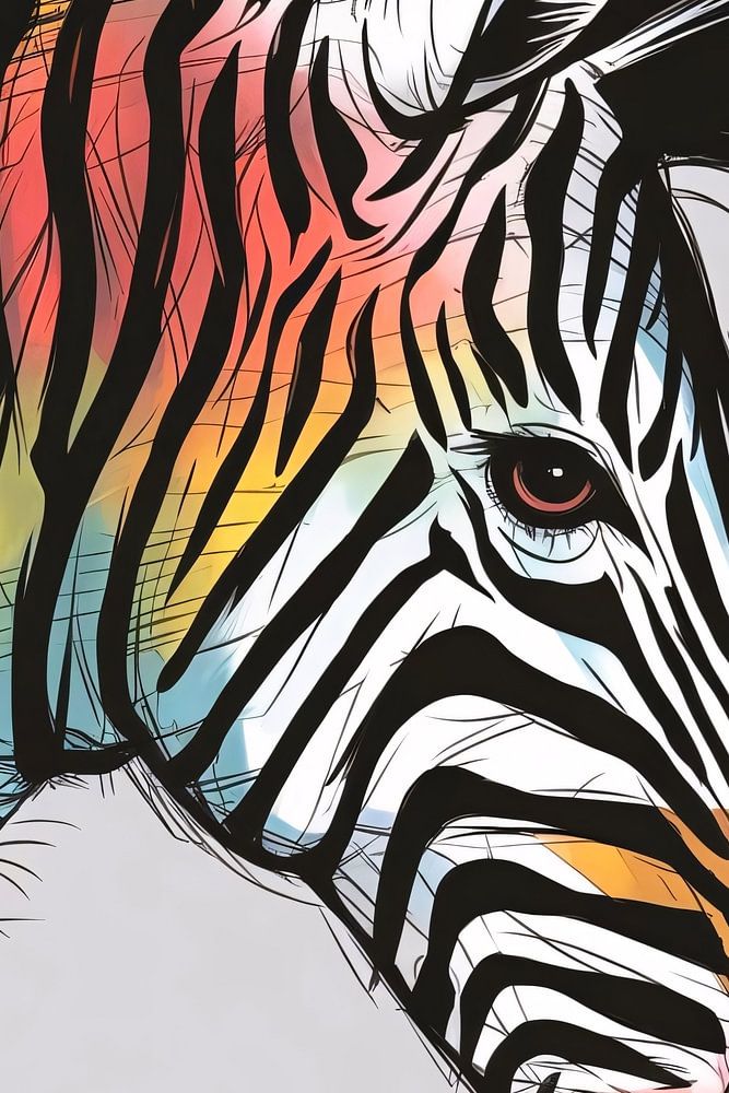 This vibrant and colourful design of a zebra is a perfect blend of digital art and modern expression. The image depicts a zebra with its iconic black and white stripes, but adds a surprising twist by introducing bright colours. From red and yellow to blue, the colours flow smoothly into each other and give the classic zebra pattern a whole new dynamic. The design is sleek and modern, making it ideal for lovers of contemporary art. This artwork would be an eye-catcher in an office space or bedroom, adding a playful yet stylish touch to any interior. Perfect for those who want to add a colourful twist to natural elements.