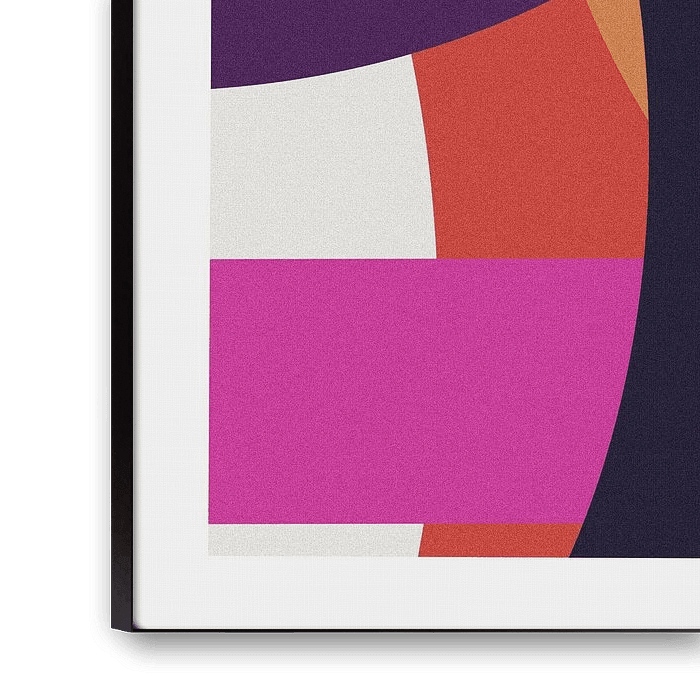 This painting is an abstract composition composed of large, overlapping shapes in bright and contrasting colours. Wide arcs and bars in dark purple, bright pink, red, orange and golden yellow intersect to create a dynamic network of lines and planes. The white background gives breathing space and emphasises the power of the colours.