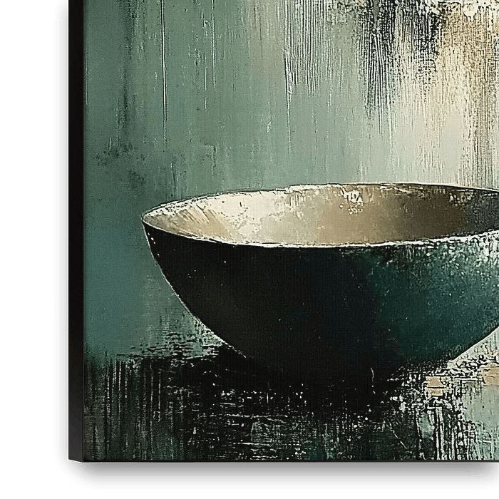 Bowl - This still life painting shows a dark green bowl centrally placed against an abstract, textural background in shades of white, grey and green.