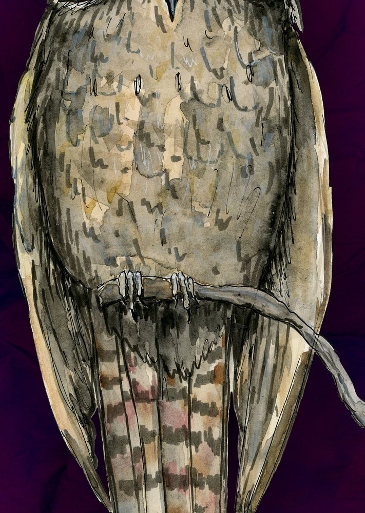 The background of the drawing is a crumpled paper texture added digitally. The colour is dark purple blue. This colour was chosen because these birds are nocturnal.