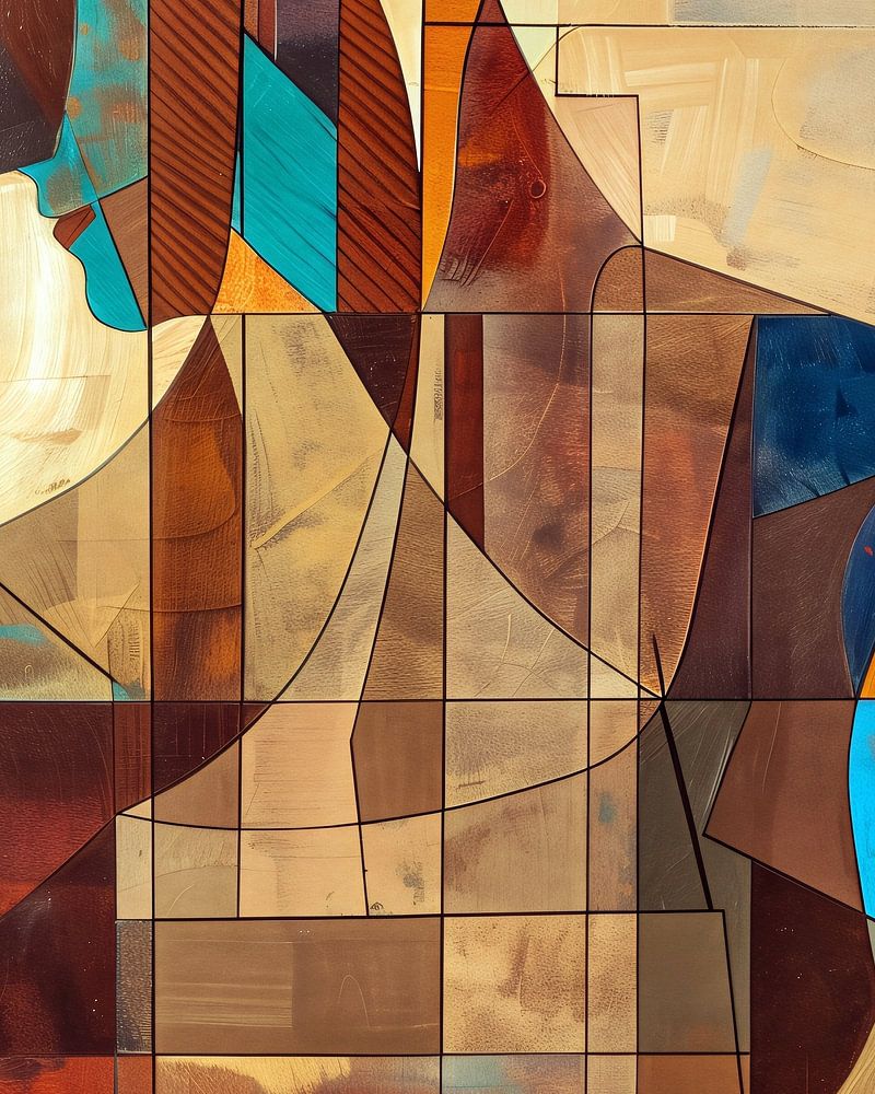 Profile portrait of a man in cubism style with wood texture in earth tones with light blue and turquoise accent colours.