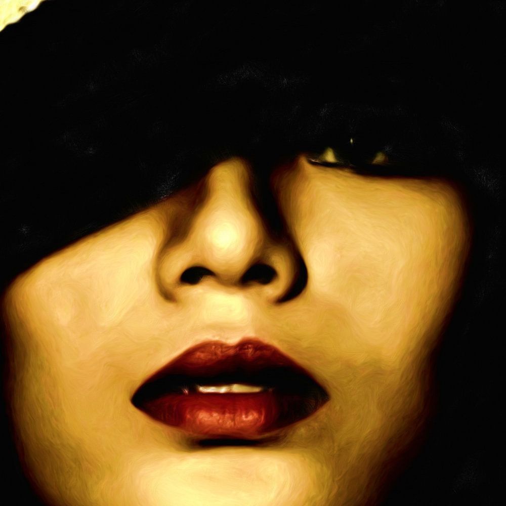 Abstract digital gouache portrait of Asian woman with gold hat on black background