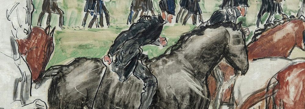 Composition study for "Jena 1813". In the foreground are three horsemen on the red, black and white horse in the movement. In the background are groups of male figures in the uniforms. The background is ocher-green