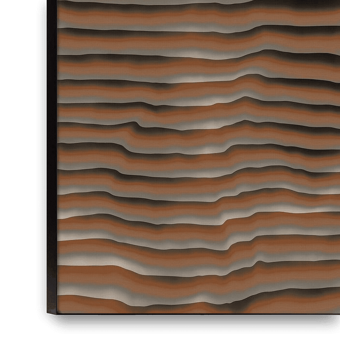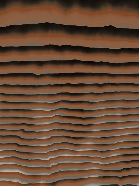 A computational art piece in portrait format: Strata band density increases toward one edge — progressive geological compression. Ridge fractures appear where rock cracks under pressure. Warm sienna earth tones. Composed in sienna, ash grey, earthy warmth, the work breathes a restrained warmth. A nuanced interplay of colour that shifts…