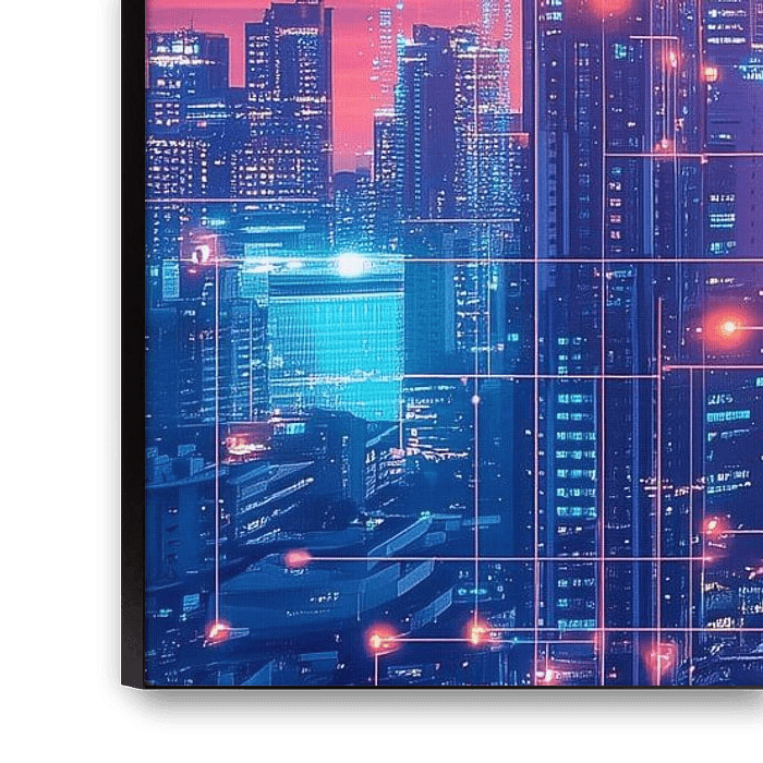 Conceptual panorama of a city skyline , illuminated by the glow of neon lights and digital world elements, captures the energy of urban life.