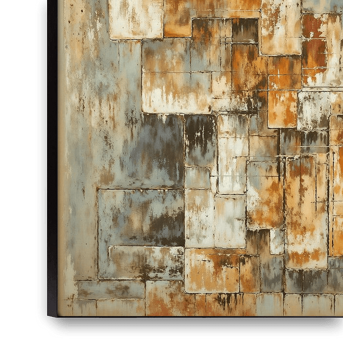 The image shows an abstract artwork with rectangular shapes superimposed, varying in size and colour. The predominant colours are earth tones such as orange, brown, beige and light blue, reminiscent of aged or weathered surfaces. The lines between the shapes are not tight, giving the whole a rough and weathered impression.