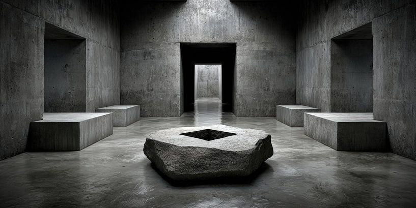 Buy this landscape artwork Concrete room with stone centre by Klaus Tesching - Art-AI on canvas, ArtFrame, poster and wallpaper, printed on demand in high quality.