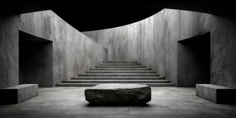Concrete step room with central stone block by Klaus Tesching - Art-AI