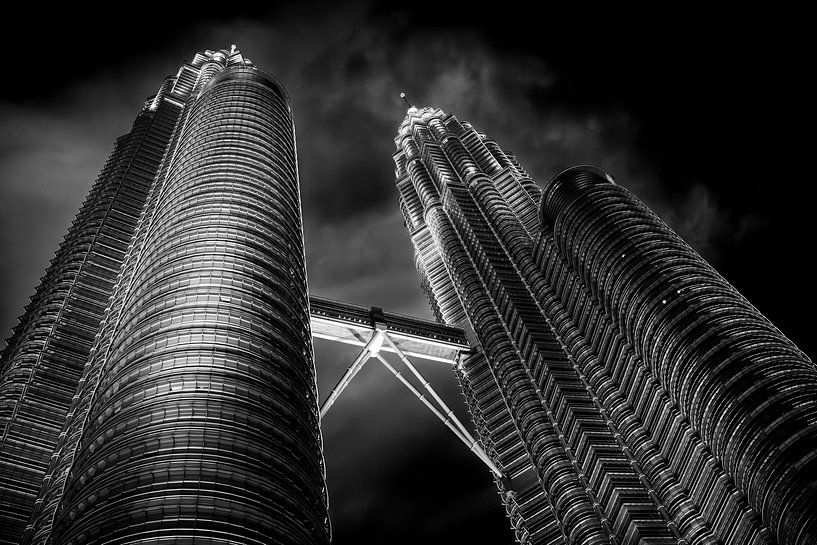 This black-and-white photograph shows the Petronas Twin Towers from a powerful low vantage point, giving the towers monumentality and tension. The gaze is automatically guided upwards along the endless repetition of lines, rings and patterns that make up the facades. The lack of colour makes the architecture take full centre stage,…