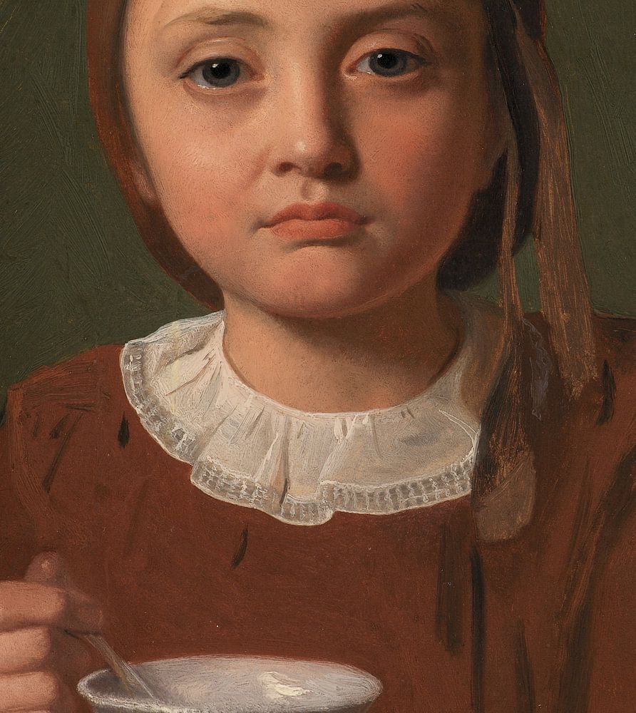Portrait of a blonde young Danish girl with a cup of drink or soup in front of her on the table.