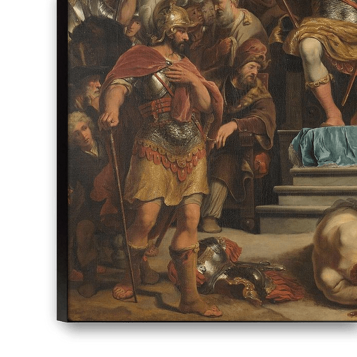 Consul Titus Manlius Torquatus has his son beheaded. The consul sits on a throne between two columns. On the ground the body of the son; the executioner holds up the severed head. On the right a soldier with a horse. In the background buildings of Rome. Consul Titus Manlius Torquatus has his son, Ferdinand Bol, beheaded. Originally painted with oil on canvas, the original size is 218 cm × b 242 cm, but at Werk aan de Muur the work can be ordered in any size and material.