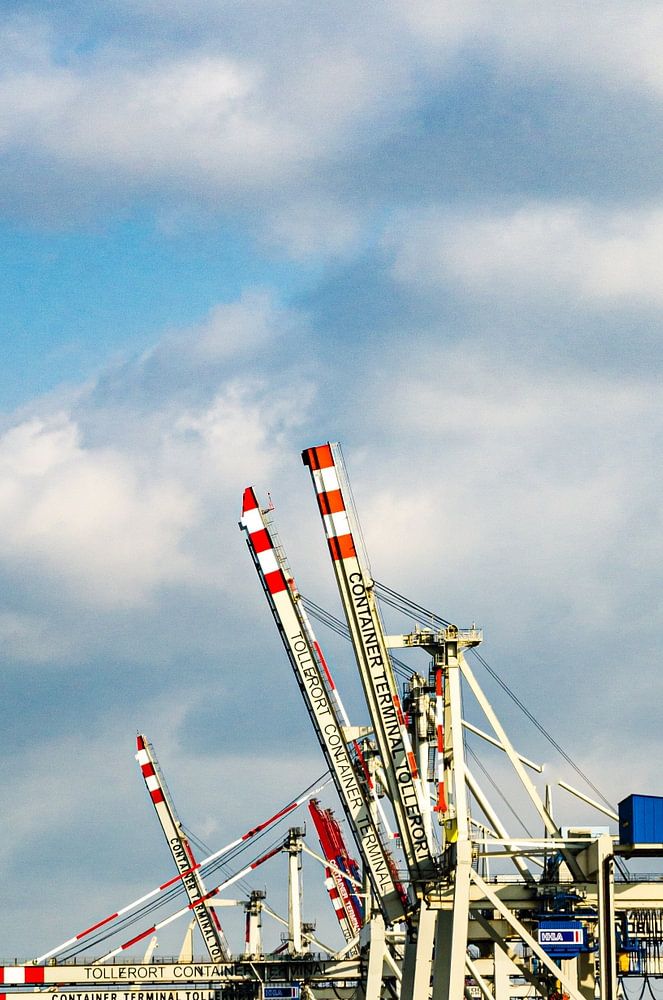 Container terminal in the port of Hamburg with ships and cloudy sky