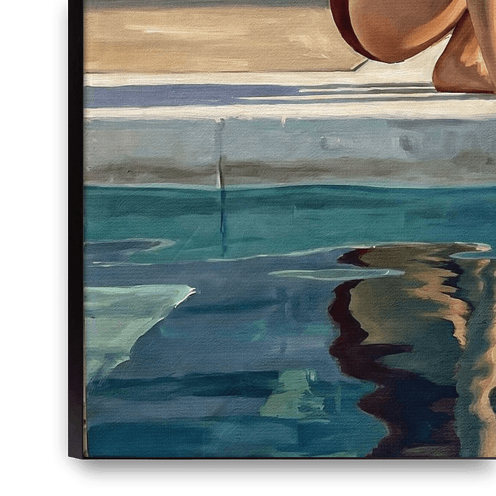 The painting captures a serene yet contemplative moment, where light, reflection, and human form converge to tell a quiet story. As the artist, I sought to explore the tension between stillness and movement, hesitation and action. The central figure—a young woman in a deep red swimsuit—sits poised on the edge of a turquoise pool, her…