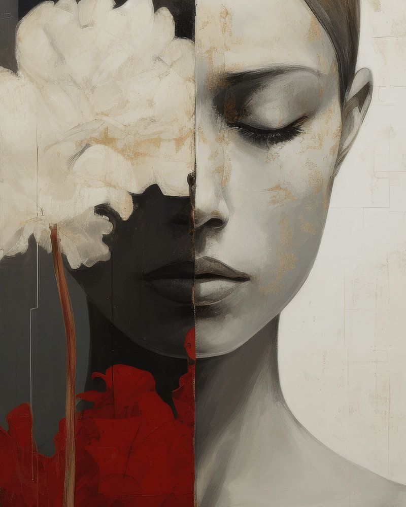 Contemporary art portrait in black, white and red. portrait of a young woman with flowers, half of her face in black, the other half in white.