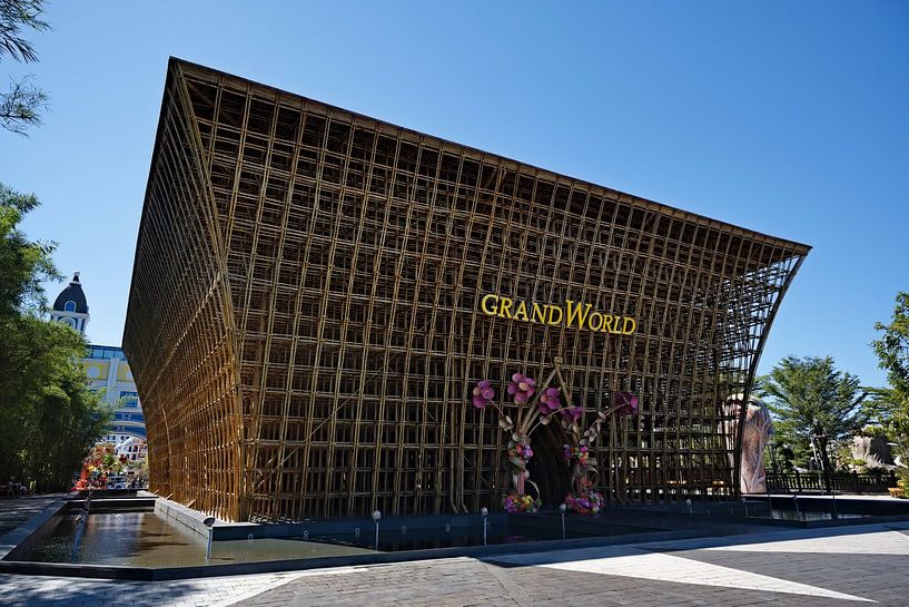 This photograph highlights a spectacular architectural structure made entirely of bamboo, located within the Grand World complex in Phu Quoc, Vietnam. The building stands out for its impressive dimensions and bold angular shape, creating a striking interplay of lines and perspectives. The dense weave of bamboo forms an openwork envelope…