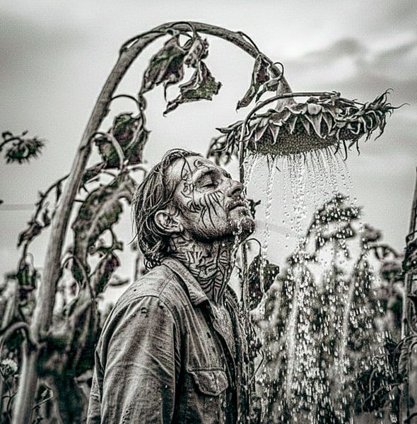 This man stands in the middle of a field of sunflowers. It is at the end of the season.