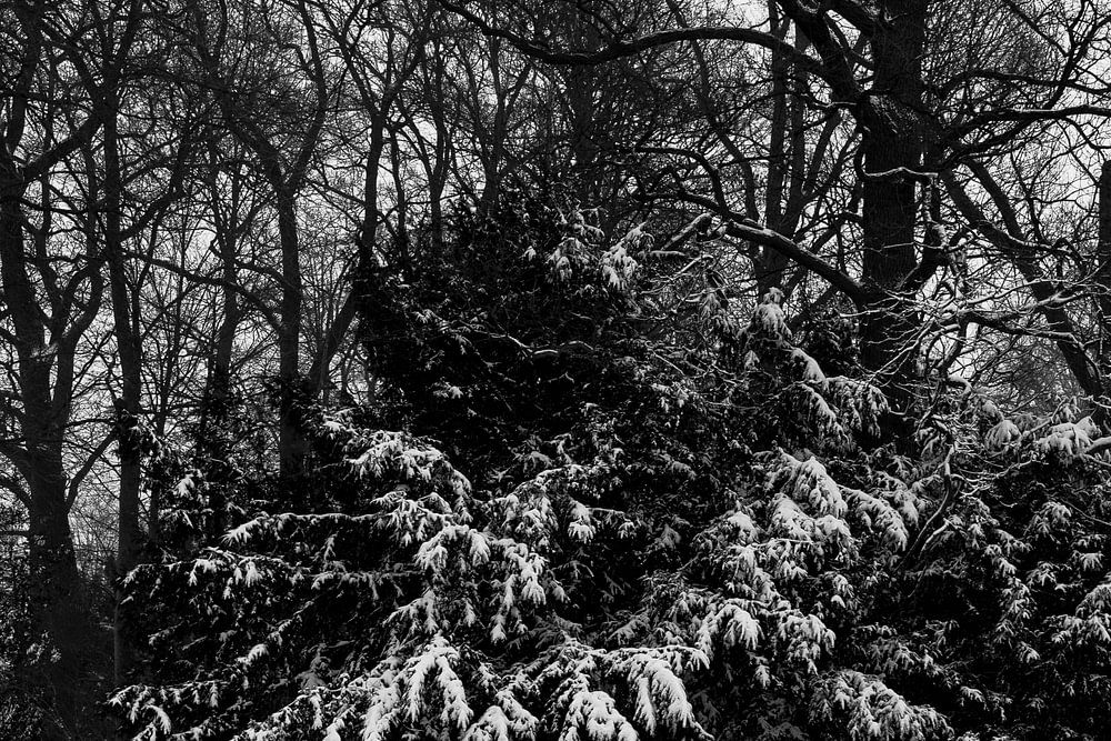 Een zwartwit foto. Aan de rand van het bos is een sloot. De bomen zitten net als het landschap onder een pak sneeuw, die een witte deken over Nederland heeft gelegd. Wat is het toch een geweldige tijd om mee te maken. De sneeuw het stille landschap, de contrasten die nu nog meer te zijn. het serene geeft me een goed gevoel.