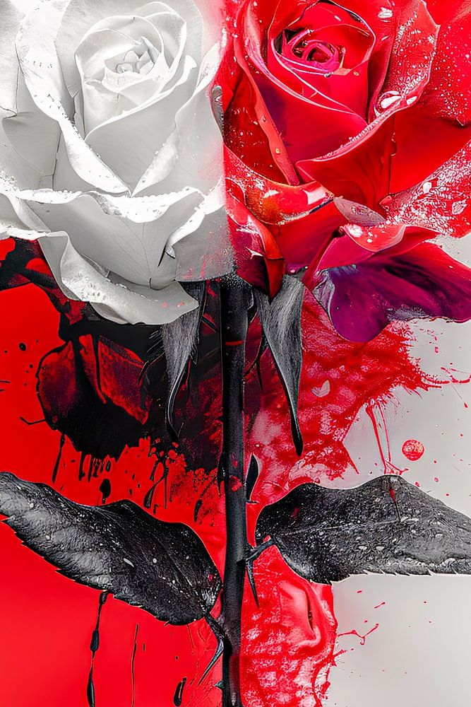 This captivating picture shows a bold depiction of two roses in a powerful colour duel. One rose, pure and pristine in its white robe, stands in stark contrast to the other rose, which is bathed in an intense red, symbolising passion and deep emotion. The black leaves and stems add a dark elegance, while the vivid splashes of red and white colour on the background create a dynamic and almost aggressive atmosphere. This scene is a visual spectacle that captures the duality of love - its purity and its intensity - in a single, poignant composition.