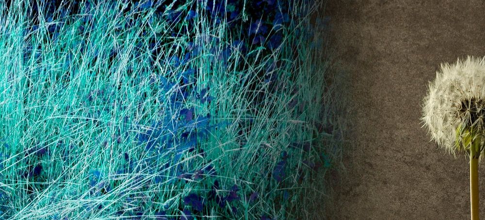 A 2-part image. On the left turbulent grass executed in turquoise and on the right a fluffy ball of a faded dandelion. One side restless in a bright color, the other side serenity in quiet color tones.