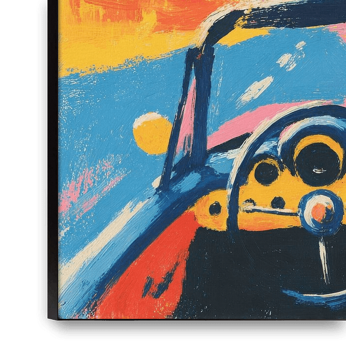 This abstract, colourful painting shows the interior of a car from a frontal perspective. A yellow dashboard with black accents and a black and yellow steering wheel form the central motif. The blue sky and ground appear behind the transparent windscreen. The background glows in shades of pink, orange and red, while vibrant green…