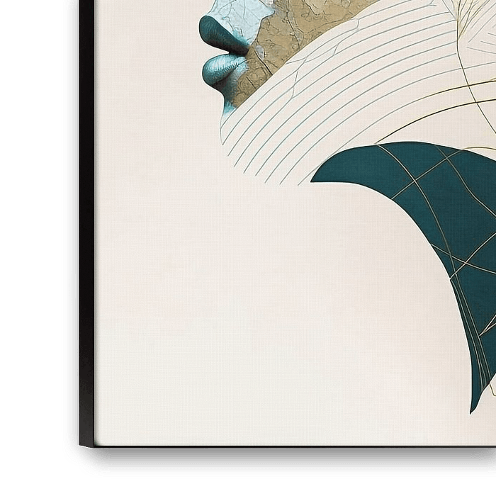 Graceful line portrait of a woman en profil. Mysterious, abstract wavy lines and circles punctuated by a serene color palette of soft, complementary pastels. Green-blue elements, sky and water, earth tones and gold. Relaxed, mindful and calm.