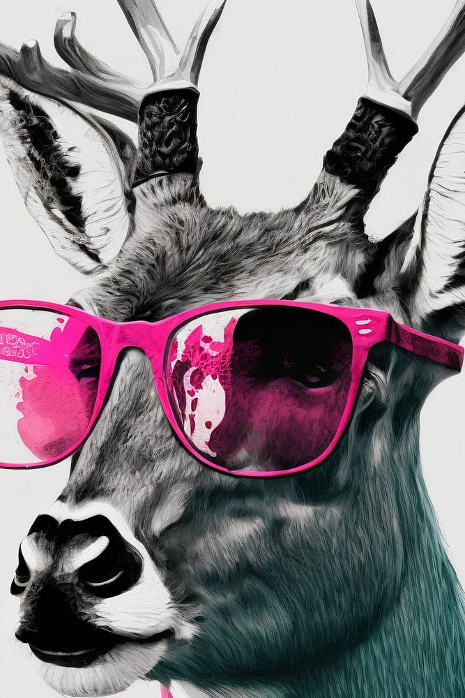 A majestic stag with impressive antlers wears striking pink sunglasses and exudes a casual attitude. The black and white image gives it a timeless elegance.