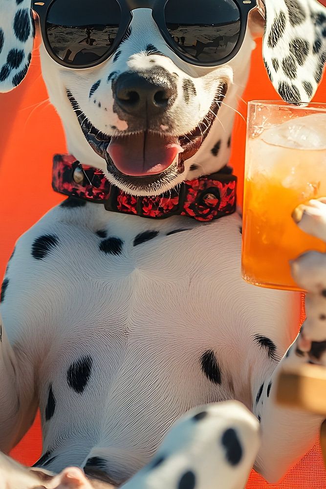 This vibrant photo captures the essence of a perfect summer's day and shows a Dalmatian who has made himself comfortable on a bright orange beach chair. The dog is wearing stylish sunglasses, giving him a touch of cool as he relaxes in the sun. With one paw outstretched, he casually holds a cocktail glass, giving the picture a humorous and charming touch. His cheerful facial expression reflects pure joie de vivre and immediately casts a spell over the viewer.