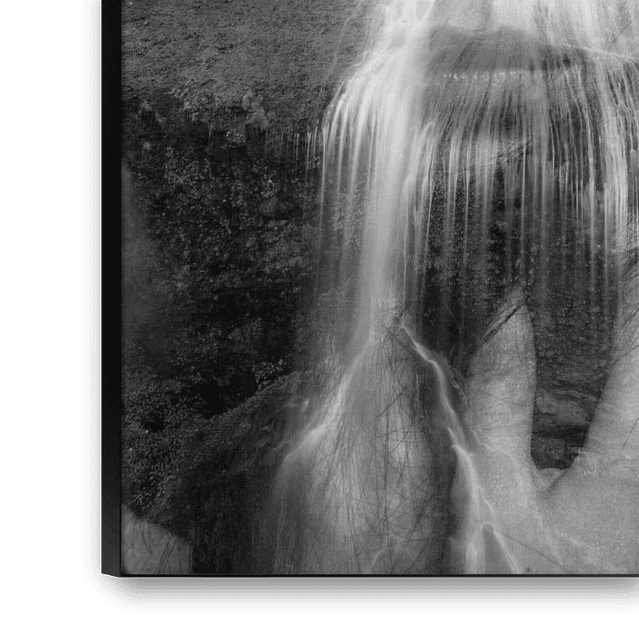 Double exposure of of two photographs. A portrait of a woman and a nature image of a rock with a waterfall are merged. The merged photos give a dreamy effect that you can let your imagination work with. Surrealistic. Black and white photography.