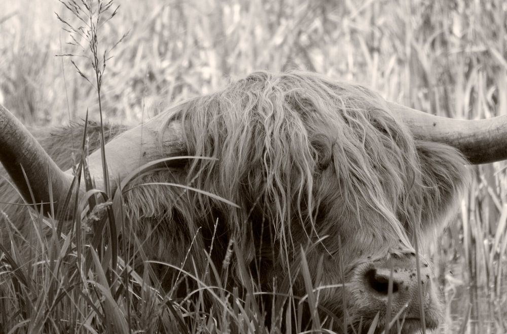 Scottish highlander seeks coolness in Drenthe lowlands on a hot summer day.