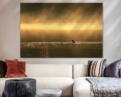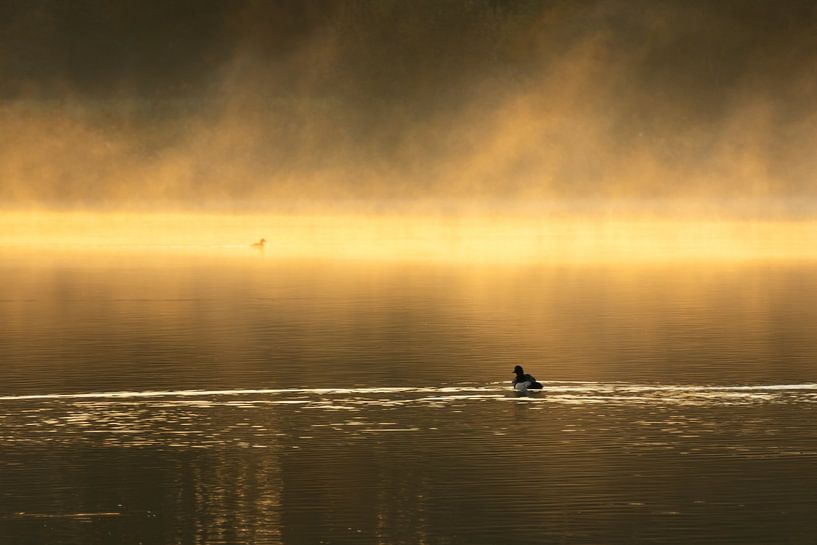 A beautiful quiet Sunday morning at Geestmerambacht recreation area in North Holland. The sun has just risen, giving the mist above the water's surface a golden colour. The remnants of a cold autumn night are still visible in the form of a layer of fog above the water. The two coots in the foreground see their friend surrounded by gold enjoying this quiet morning.