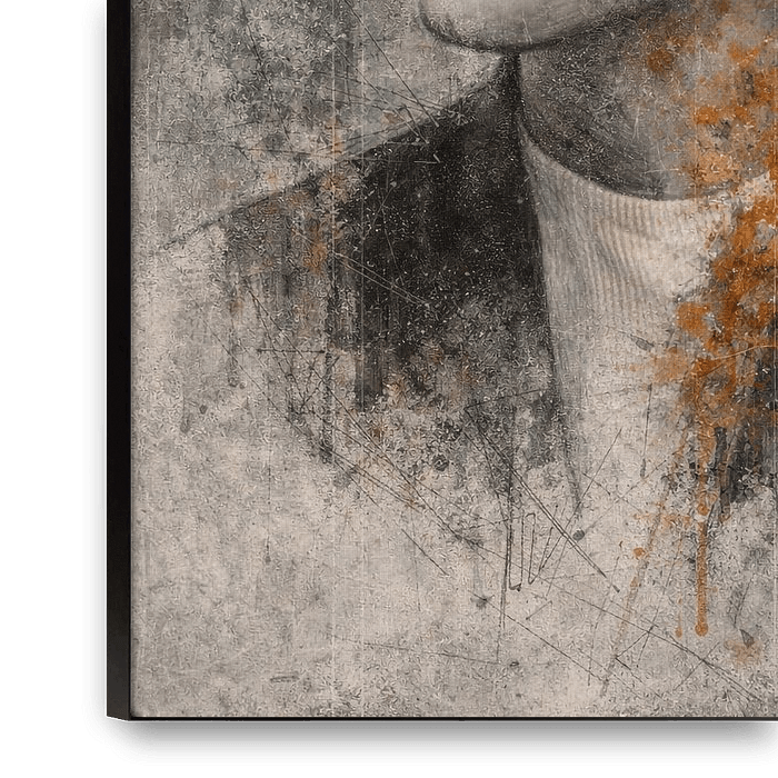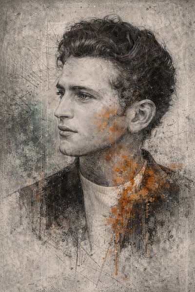 The work on display is an abstract, digitally painted portrait in half-profile. The depiction combines realistic facial features with expressive, graphic elements such as lines, hatching, scratched structures and splashes of colour. A reduced colour palette of grey, black and white tones is complemented by accents in rust orange, copper…